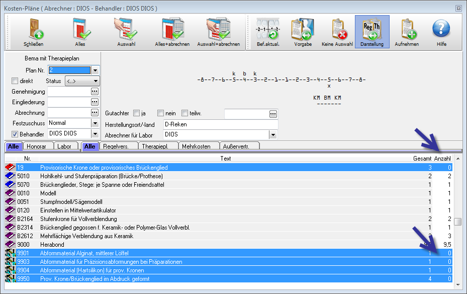 Sobald Sie einen Plan ausgewählt haben werden die Felder Festzuschuss, Behandler, Herstellungsort/-Land und Abrechner für Labor automatisch, laut Plandaten, ausgefüllt. Zudem werden Ihnen alle geplanten Leistungen aufgezeigt. Entscheiden Sie ob alle geplanten Leistungen in die Abrechnung übernommen werden sollen, hierzu klicken Sie das Symbol Alles an. Oder Sie wählen bestimmte Leistungen aus, in dem Sie die Strg Taste gedruckt halten und die Leistungen zur Abrechnung mit einem linken Mausklick markieren. Anschließend klicken Sie, zur Übernahme der Leistungen in die Abrechnung, auf das Symbol Auswahl.