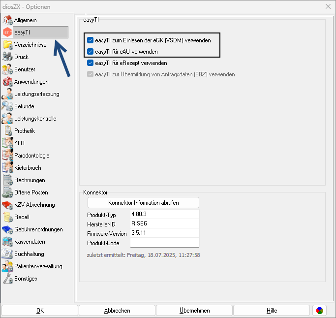 Wählen Sie die Rubrik easyTI aus und setzen den Haken bei "easyTI zum Einlesen der eGK (VSDM) verwenden" und bei "easyTI für eAU verwenden".