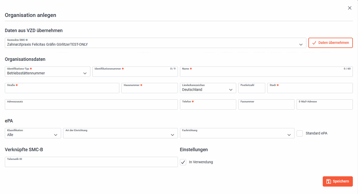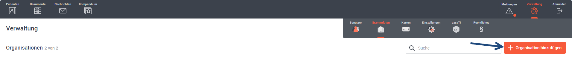 Zuerst füllen Sie die Daten der Organisation aus. Hierzu wählen Sie den Button "+ Organisation hinzufügen" an.