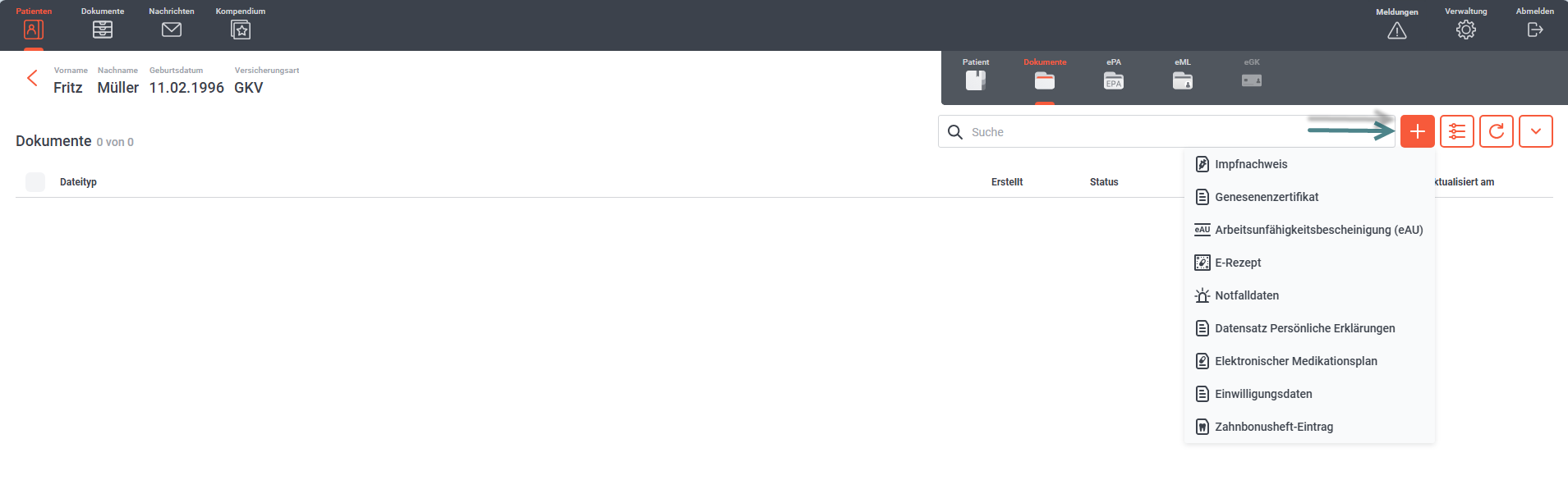 Wählen Sie den richtigen Patienten mit einem Mausklick aus. Über das Plus legen Sie ein neues Dokument für den Patienten an.