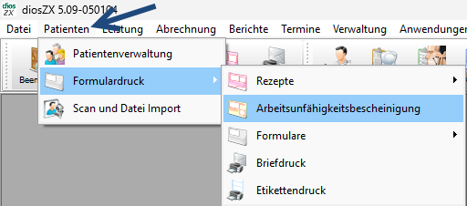 Die Erstellung einer eAU starten Sie in dem Sie den Menüpunkt Patienten, im Untermenü Formulardruck und dann den Auswahlpunkt Arbeitsunfähigkeitsbescheinigung auswählen.