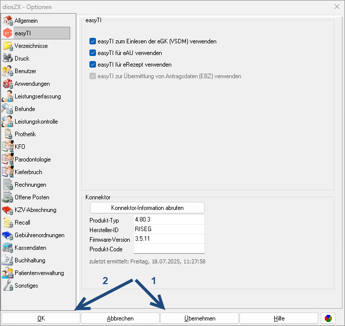 Wählen Sie die Rubrik easyTI aus und setzen den Haken bei "easyTI zum Einlesen der eGK (VSDM) verwenden" und bei "easyTI für eAU verwenden".