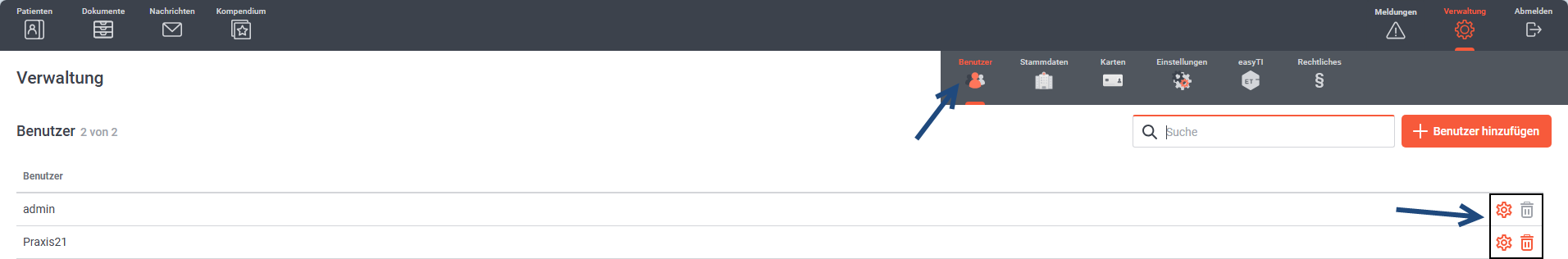 Es besteht die Möglichkeit über das Symbol "Zahnrad" Ihr vorhandenes Passwort zu ändern oder über das Symbol "Mülleimer" den Benutzer zu löschen. Sollten Sie Änderungen vornehmen wollen, kontaktieren Sie bitte zuvor Ihren DVO (Dienstleister vor Ort), um Fehler zu vermeiden.