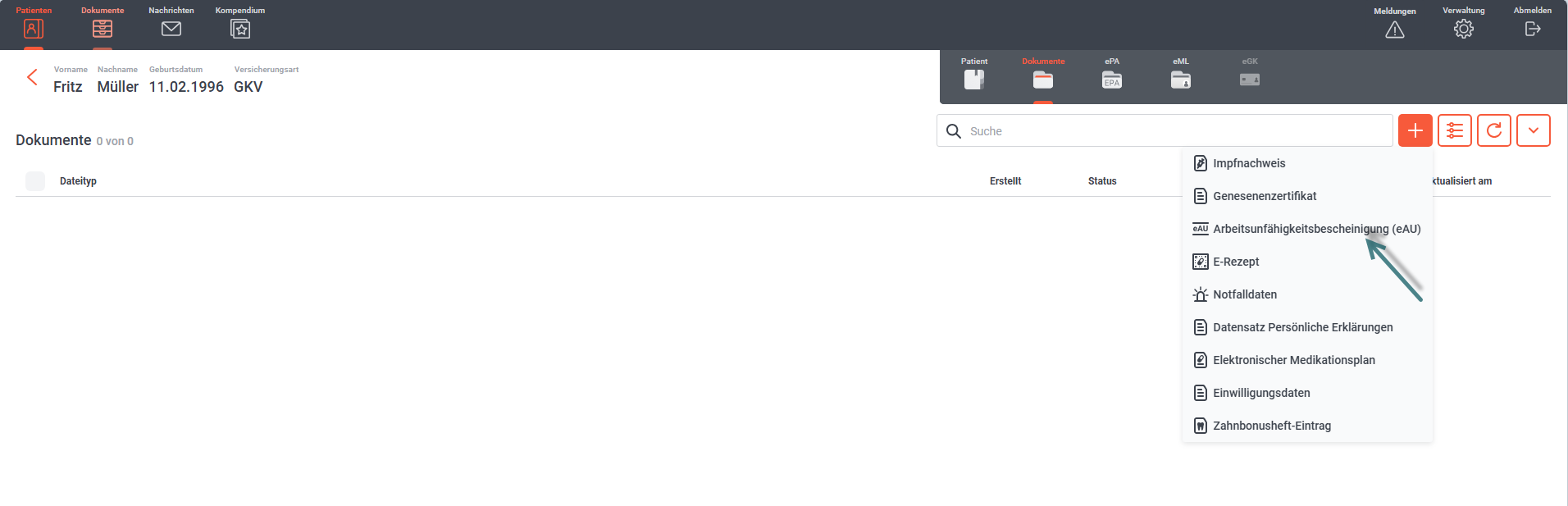 Wählen Sie das Dokument aus, welches Sie anlegen möchten. In diesem Fall die Arbeitsunfähigkeitsbescheinigung.