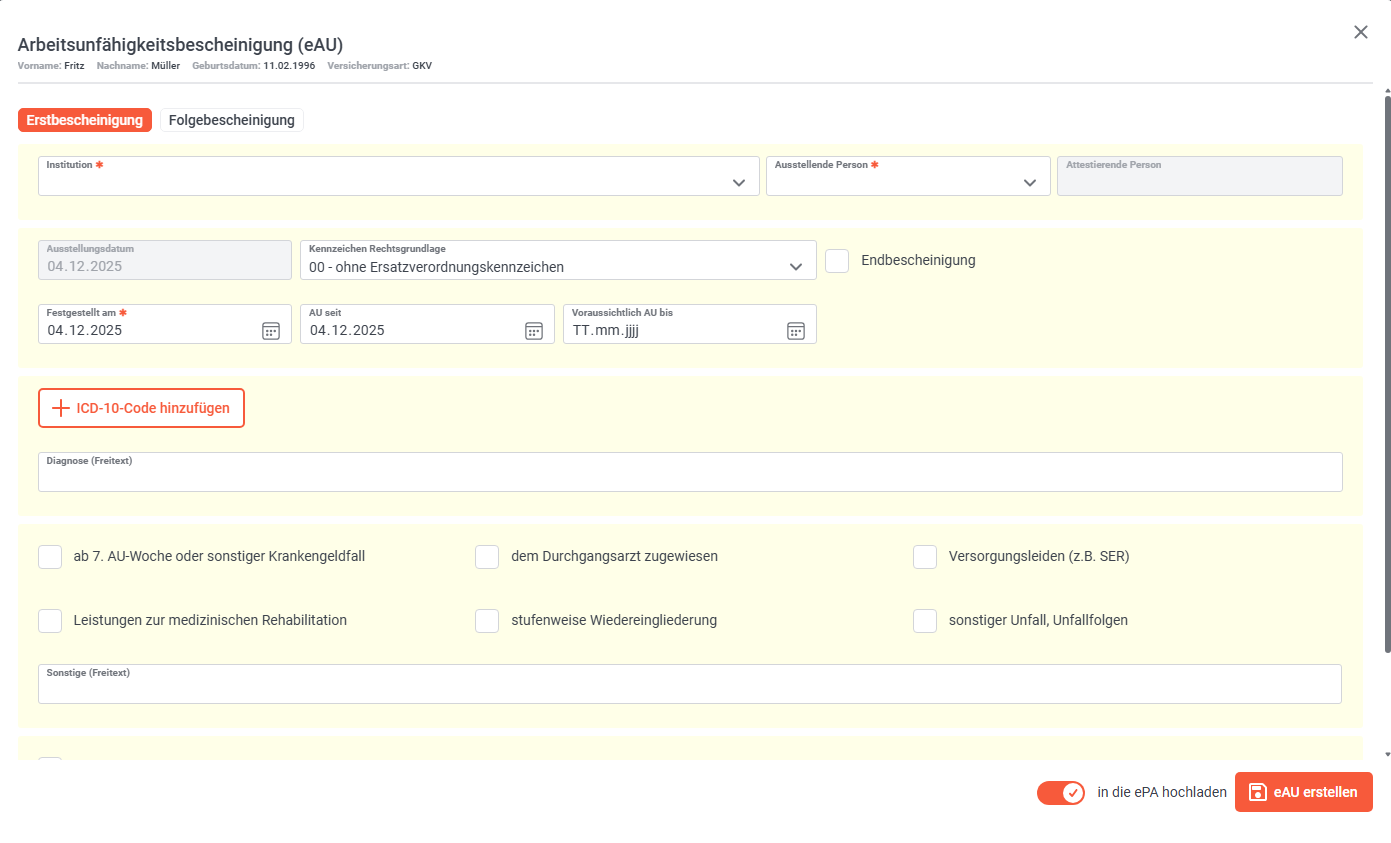 Alle Felder die mit dem Symbol * gekennzeichnet sind, sind Pflichtfelder und müssen, falls vom Programm noch nicht erfolgt, für die Erstellung einer eAU ausgefüllt werden.
