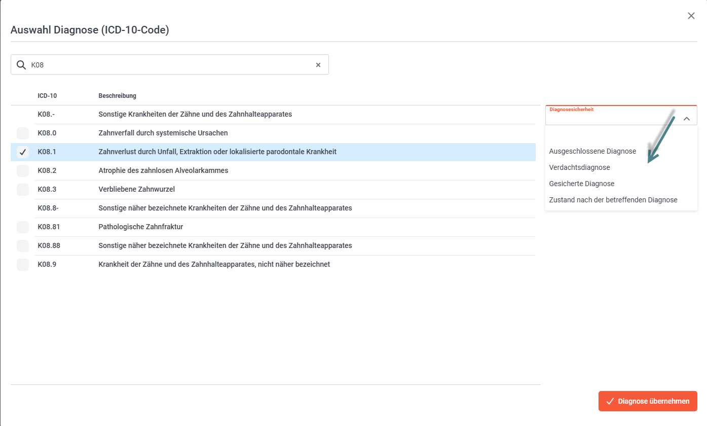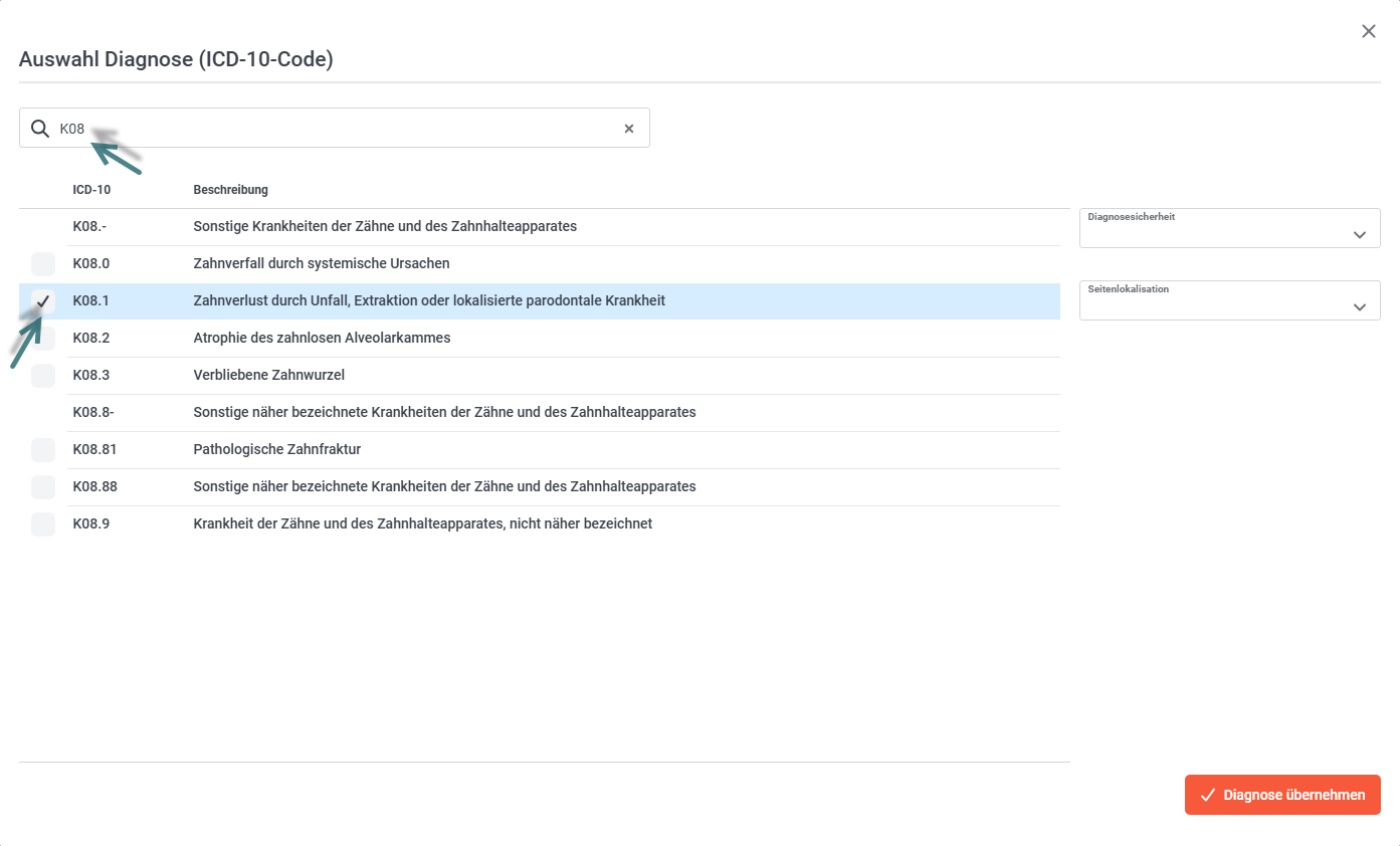 Nach der Auswahl des Button "ICD-10-Code hinzufügen", öffnet sich ein zusätzliches Fenster. Sie können zur einfachen und schnellen Auswahl die Suchfunktion nutzen. Suchen Sie nach Stichworten wie bspw. Zahn oder nach einem Code bspw. K08.