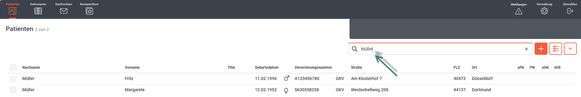 Wählen Sie den richtigen Patienten mit einem Mausklick aus. Über das Plus legen Sie ein neues Dokument für den Patienten an.