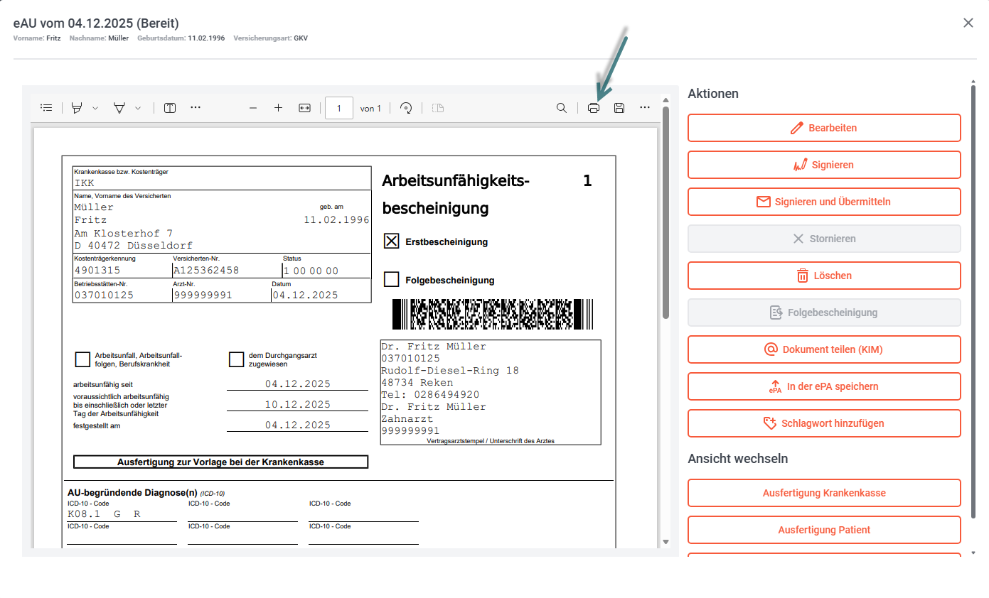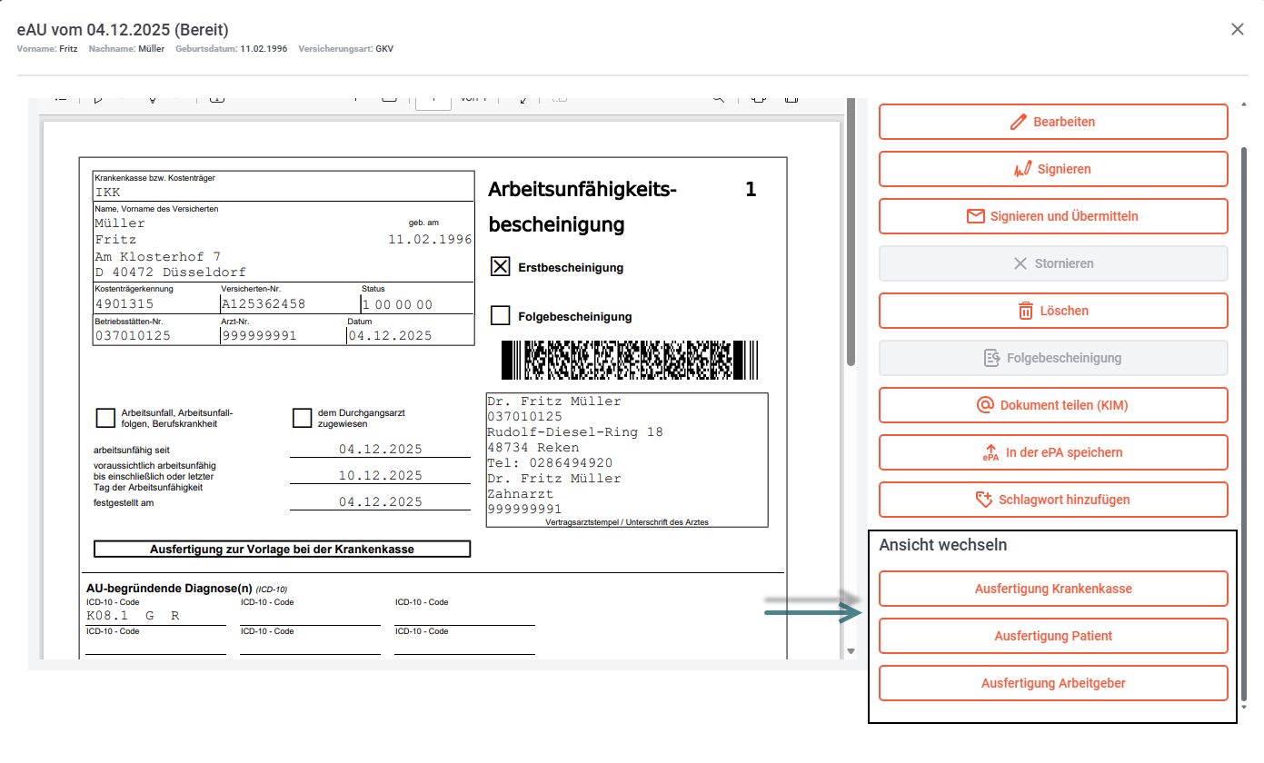 Sie können die Druckansicht zwischen Krankenkassen-, Patienten- und Arbeitgeberbescheinigung wechseln.
