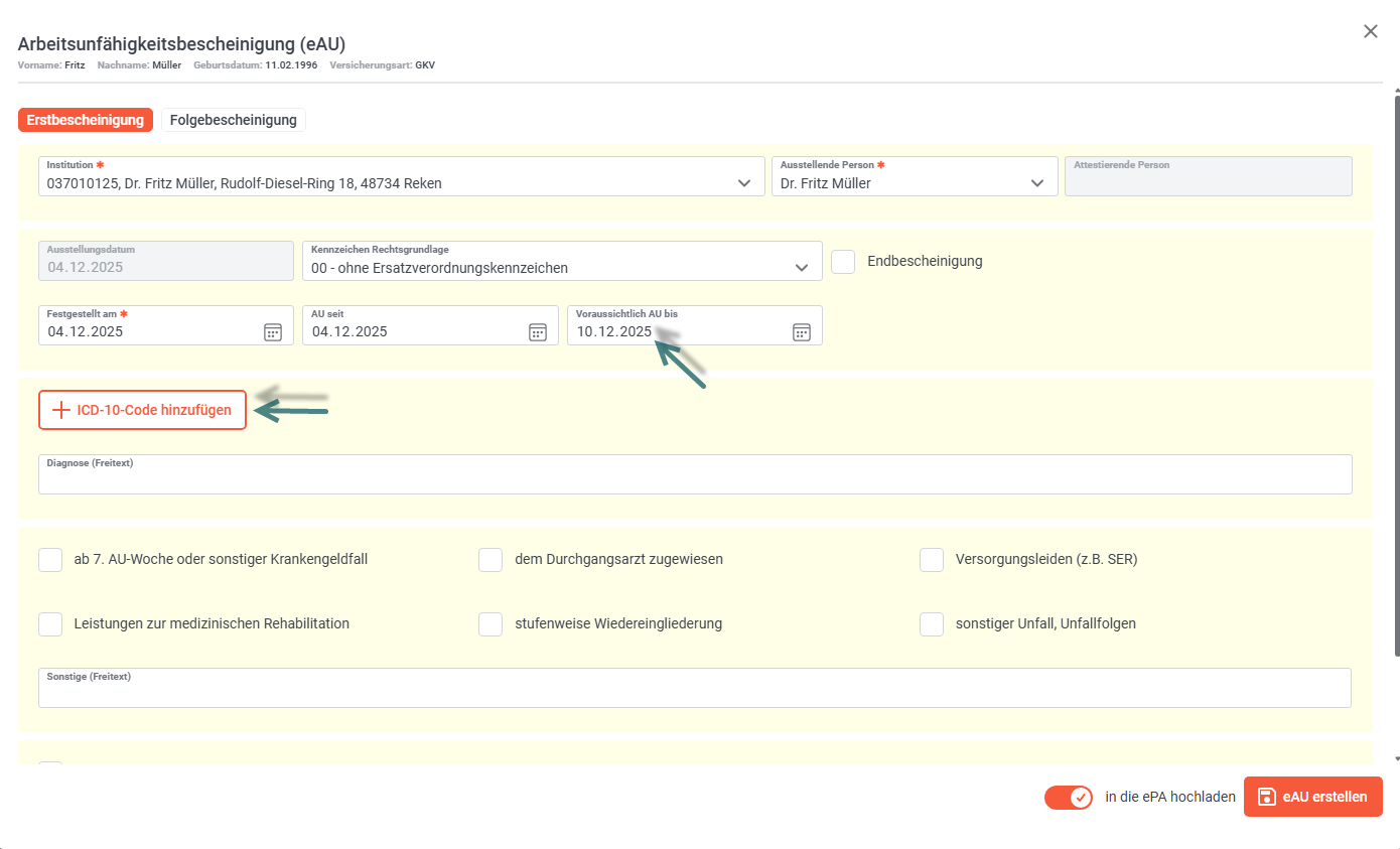 Für die erfolgreiche Erstellung einer eAU geben Sie das voraussichtliche Enddatum und den Grund der Krankschreibung an. Die Begründung erfolgt in Form eines ICD-10 Codes.