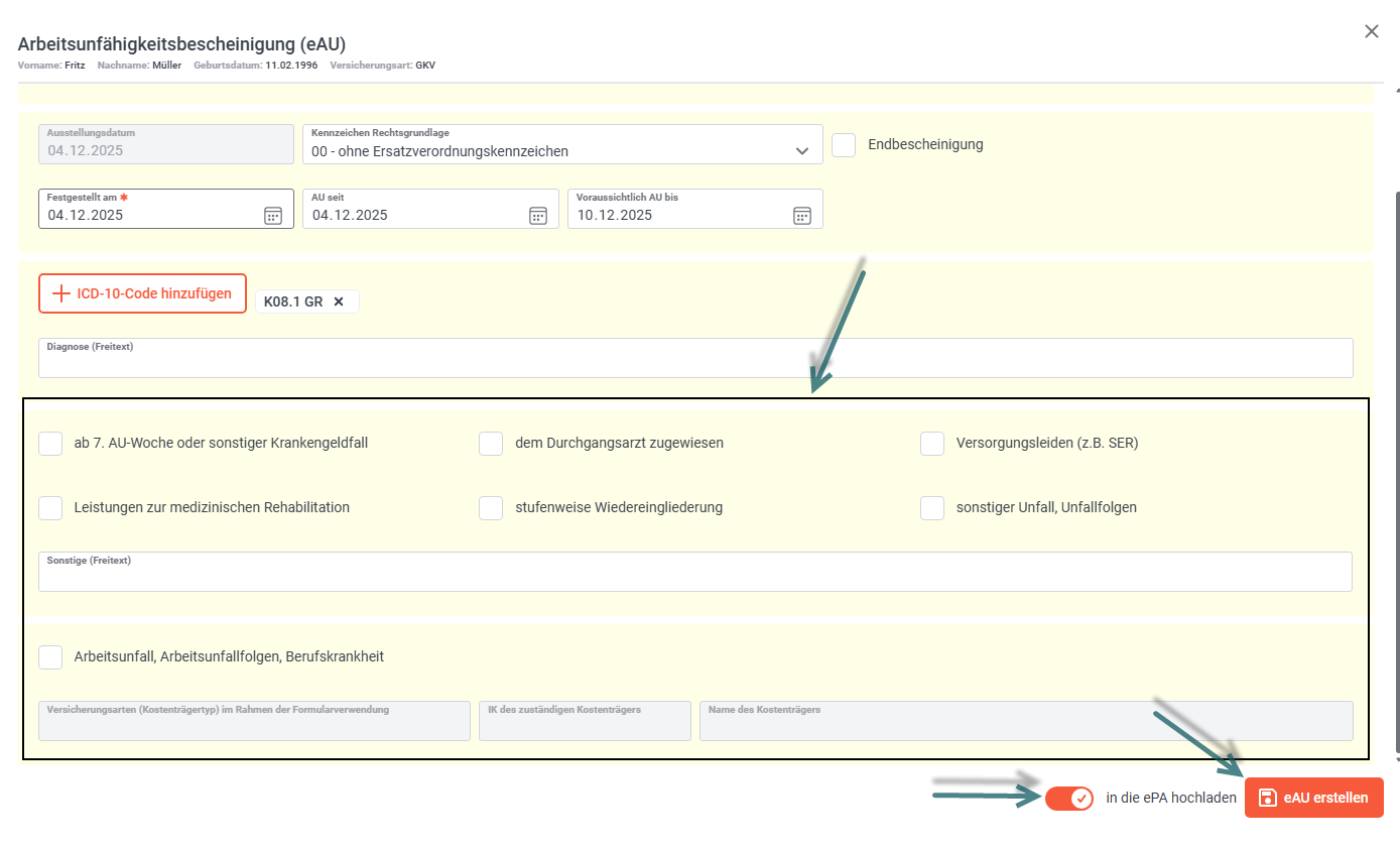 Wenn die eAU in die ePA hochgeladen werden soll, setzen Sie hierzu den Schalter bei "in die ePA hochladen".