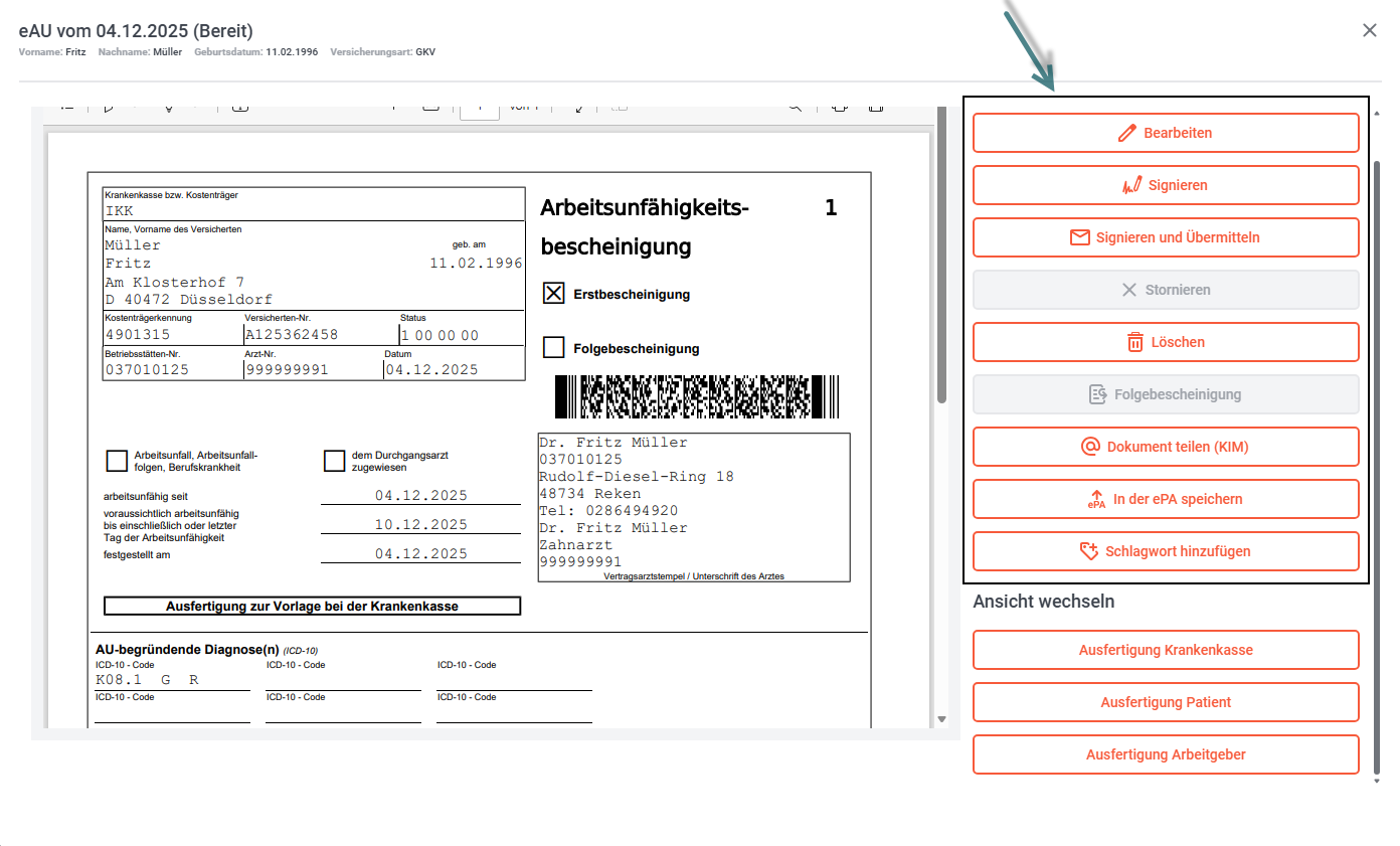 Sie erhalten nun in der linken Fensterhälfte  eine Ansicht der Arbeitsunfähigkeitsbescheinigung, in der rechten Fensterhälfte können Sie die eAU erneut bearbeiten, signieren und/oder übermitteln.